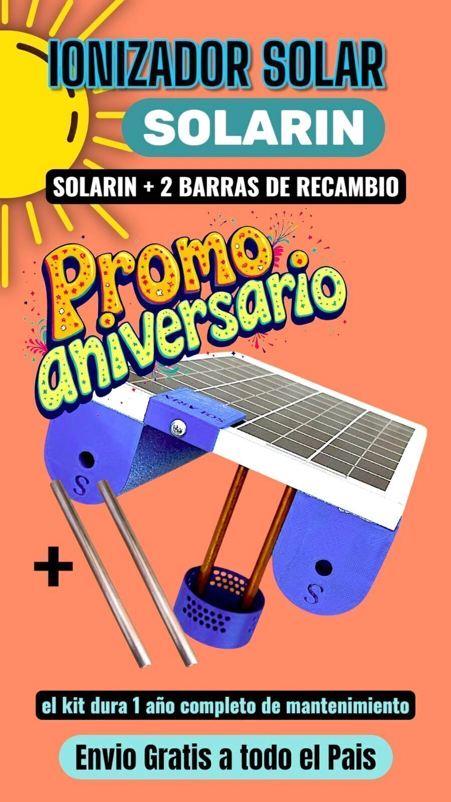 El ionizador llega listo para armar: simplemente fijá las barras de cobre, colocá los flotadores y dejalo flotar con el panel solar hacia arriba. El Solarin libera iones durante las horas de sol, sin necesidad de botones ni cables eléctricos.